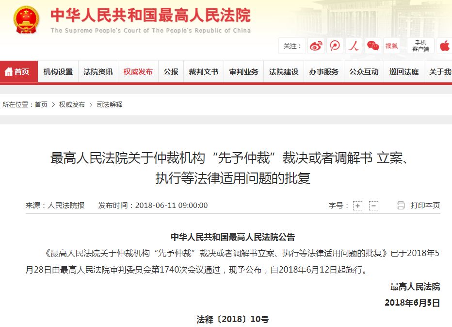 《最高人民法院关于仲裁机构“先予仲裁”裁决或者调解书立案、执行等法律适用问题的批复》已于2018年5月28日由最高人民法院审判委员会第1740次会议通过,现予公布,自2018年6月12日起施行。